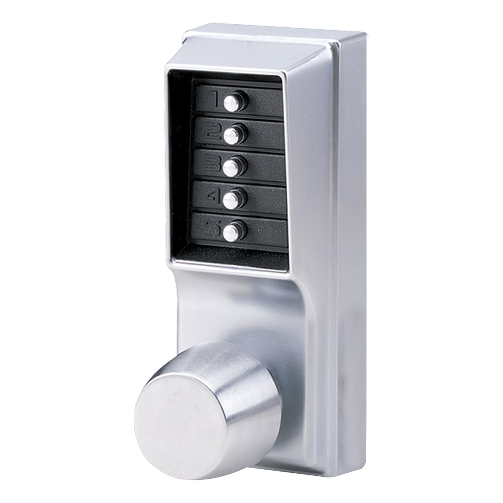 The weather resistant Simplex 1000 series from dormakaba (formerly known as Kaba) is a fully mechanical digital lock solution, eliminating the hassle of frequent battery replacement. The lock can be easily programmed via the 5 pushbutton keypad and does not require the lock to be removed from the door. This knob operated digital lock supports a single access code and can be easily reversed on site to suit both left and right handed doors. This cost effective access control solution also features vandal resistant, solid metal pushbuttons for outstanding durability. The additional thumb-turn activated free passage mode is particularly useful for situations where you need to enter the building several times in quick succession, such as unloading a car or van.